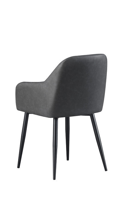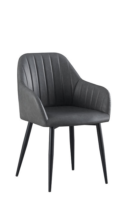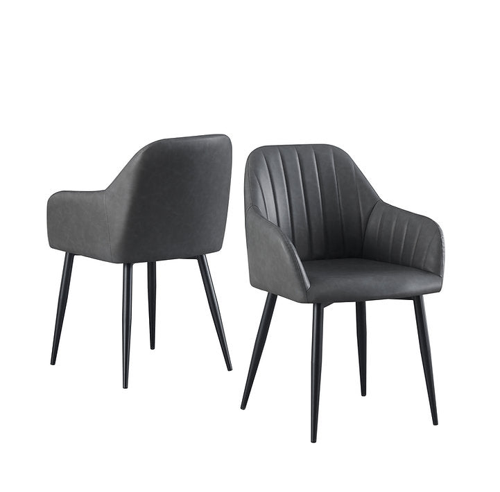 The matching dining chairs are upholstered in soft grey PU leather, offering a clean, contemporary look with easy care. Integrated armrests provide added comfort and support, while vertical channel stitching enhances the overall elegance. Tapered black steel legs complete the design with durability and style.