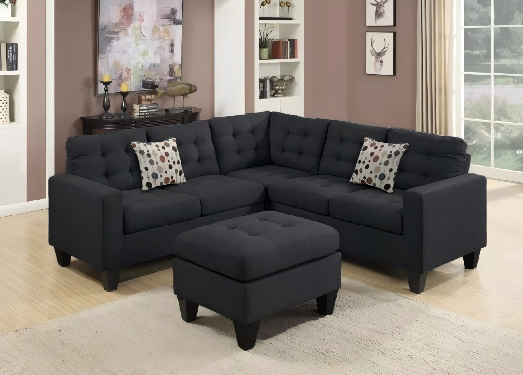 Crafted with a solid wood frame and upholstered in durable fabric, this sectional is built to last while offering a soft, inviting feel. The tufted back cushions enhance both comfort and appearance, while the neutral black and grey tones make it easy to blend into any décor style.