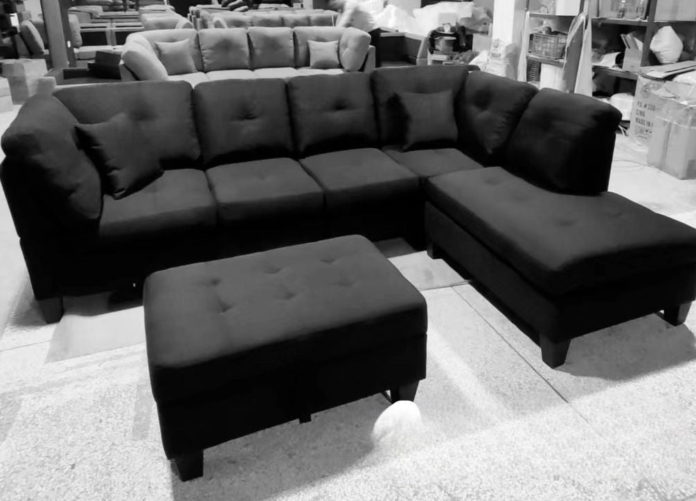 Modern Fabric Sectional Sofa with Storage Ottoman – Black or Grey (Reversible Chaise)